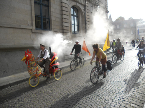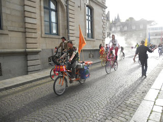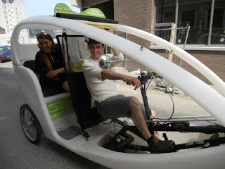 .... Jean Baptiste et Evan, two Velotaxi cab drivers. We crancked up the soundsystem on Raymundo and went for a little spin round the streets of Rennes with them, in search for tourists to take a ride in the taxi, but picked up J.B's girl friend Berengere and found a nice beer garden instead.